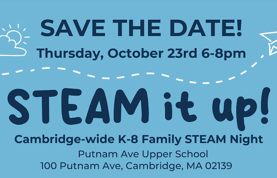 Join the Cambridge-wide K-8 Family STEAM Night featuring hands-on STEAM activities. This event is held at Putnam Ave Upper School.