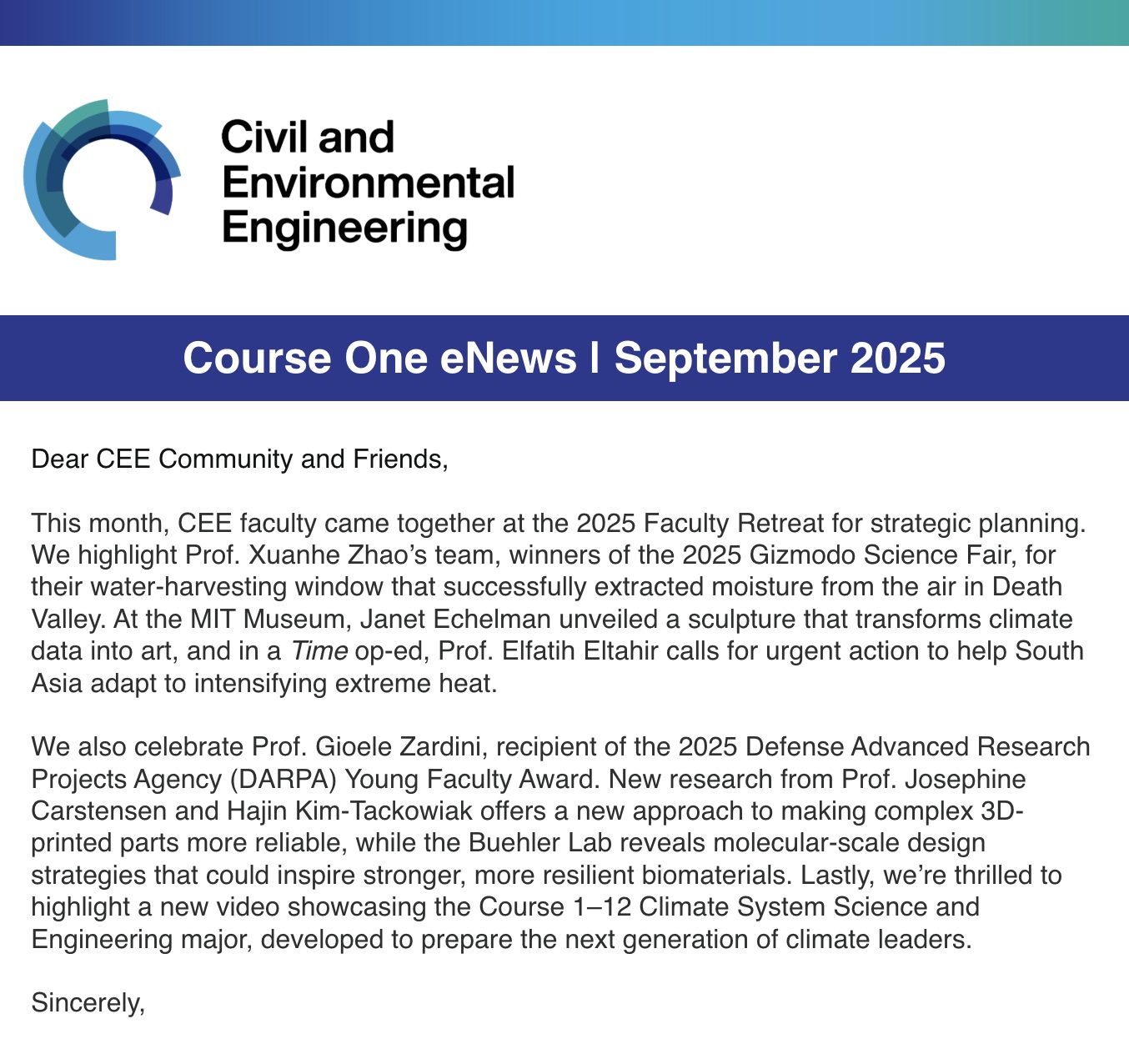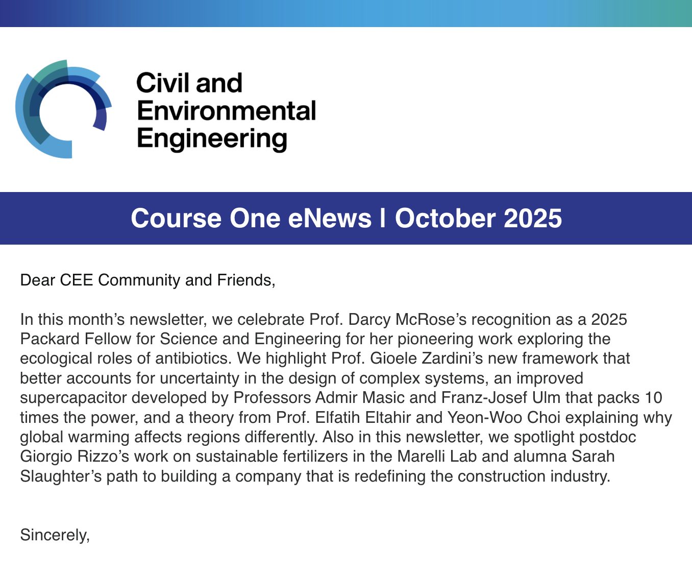 The Course One newsletter is a monthly email newsletter that highlights the department’s research, news stories, and the interesting people that make up our dynamic community. Subscribe and view past issues below.